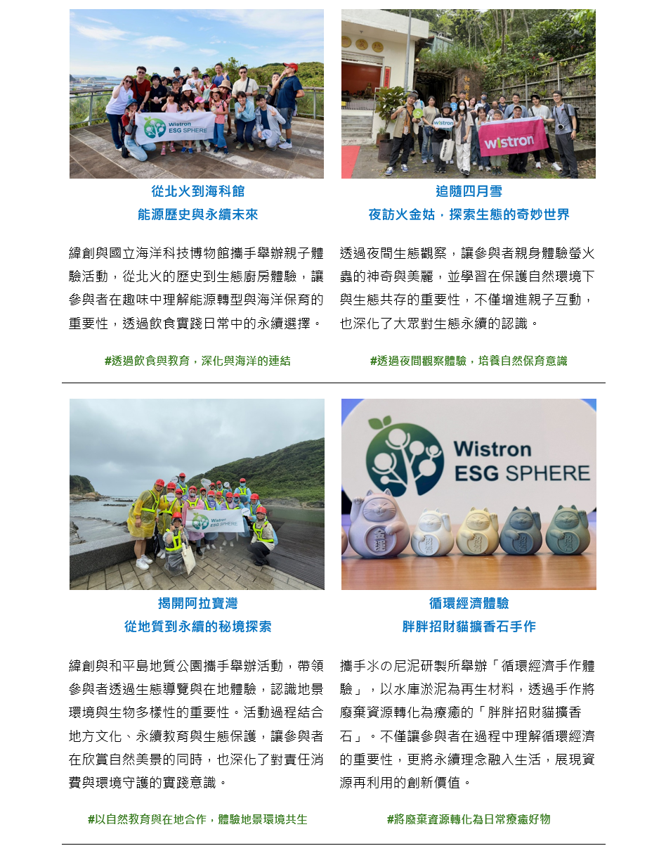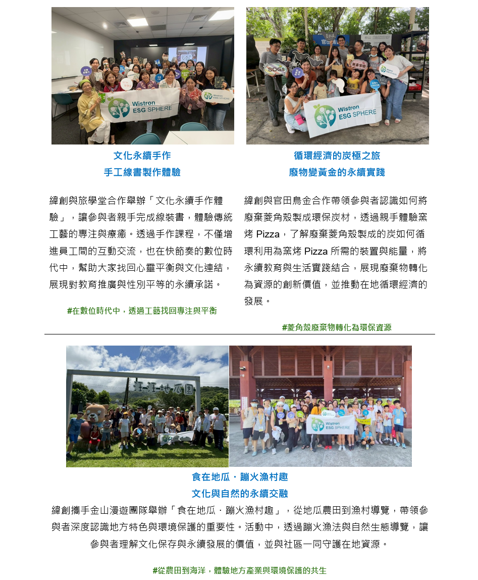 | 緯創與台灣地方創生基金會建立長期夥伴關係,推動 ESG 精神在地實踐。 我們鼓勵同仁攜家帶眷參與永續遊程,透過實際行動支持在地文化與環境保護, 讓永續不只是理念,更是生活的一部分。這些合作不僅讓地方團隊獲得穩定客群,也創造可預期的獲利來源,使他們能專注發展核心使命,持續為社會創造價值。 ![]() ![]() |
